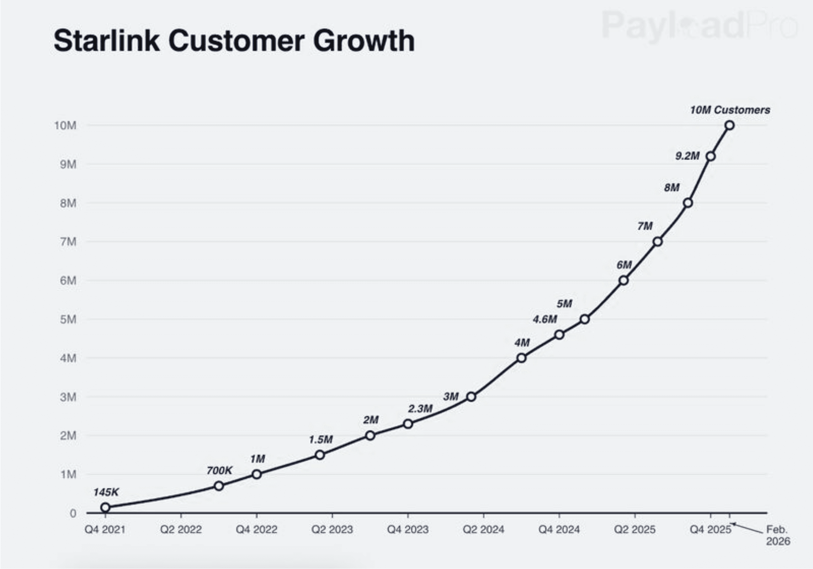 Starlink subscriber growth, 2021–2026. Source: Jack Kuhr, Payload Space