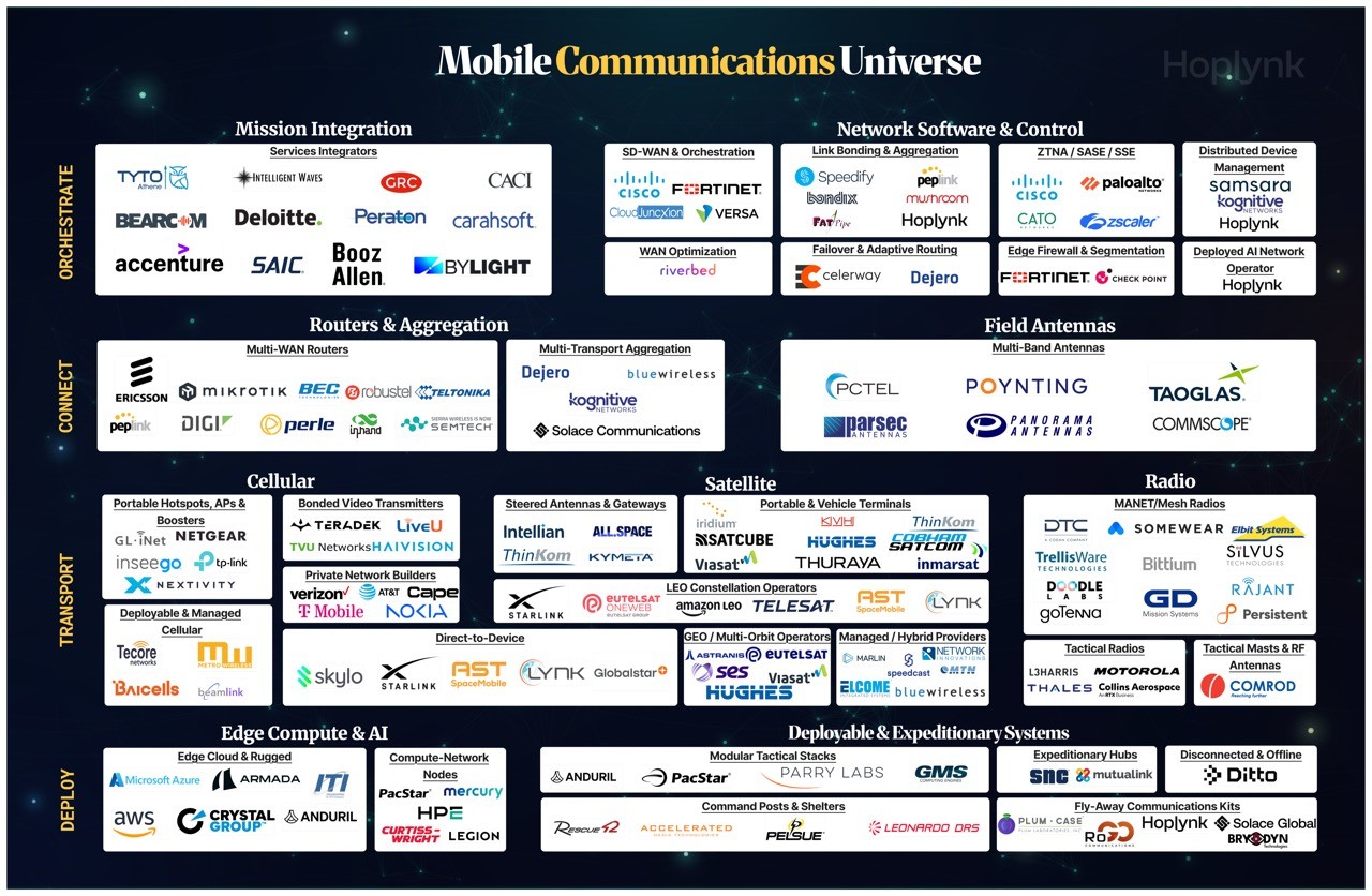 These are the substrate of modern mobility. The names are not household, but have quietly powered industry for years, including Ericsson (via Cradlepoint), Peplink, Digi, Semtech, MikroTik, Teltonika, Robustel, BEC, Perle, and InHand. Each device is a small, portable aggregation point that can hold and arbitrate between multiple transports (individual ways to broadcast and receive your communications). This category is almost entirely commercial-origin. The defense market adopted it wholesale because the alternative, purpose-built military routers, were orders of magnitude more expensive, less capable, and updated less frequently. The convergence here is complete. Cradlepoint under Ericsson is the enterprise scale leader with a strong government business; Peplink is the bonded-multi-WAN specialist; MikroTik and Teltonika are the performant-for-the-price plays that keep showing up in unexpected deployments because they just work. The category is healthy, fragmented, and mostly commoditizing. Margin may compress further as volume grows. The winners will be the vendors that integrate cleanly with whatever Orchestrate-layer software ends up dominant, which is why the category is a natural acquisition target for companies higher in the stack.